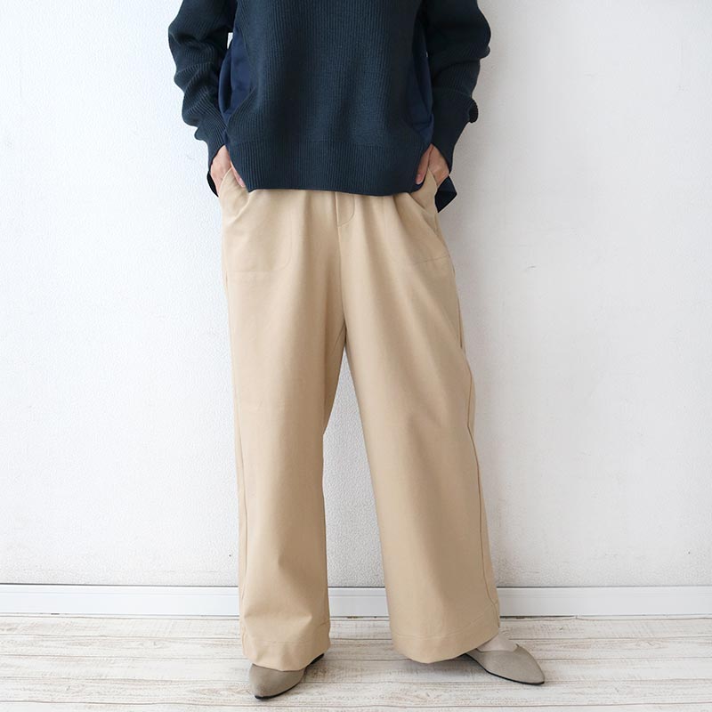 テーパードパンツ、ワイドパンツはストレッチ性に優れているから座っても楽でシワにもなりにくい素材で