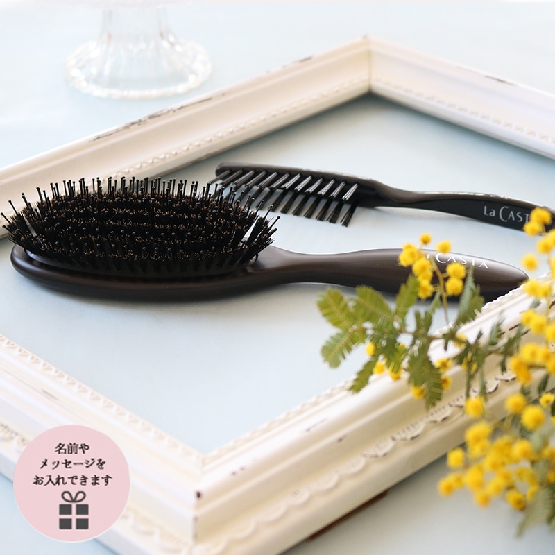 こちらのヘアブラシは、使っていく内にブラシに絡まった髪の毛がたまってしまいますので、それを取り除く専用ブラシをお付けしています。贈り物で受け取って初めてお使いいただく方にも、お手入れをしながら長く使っていただけます。