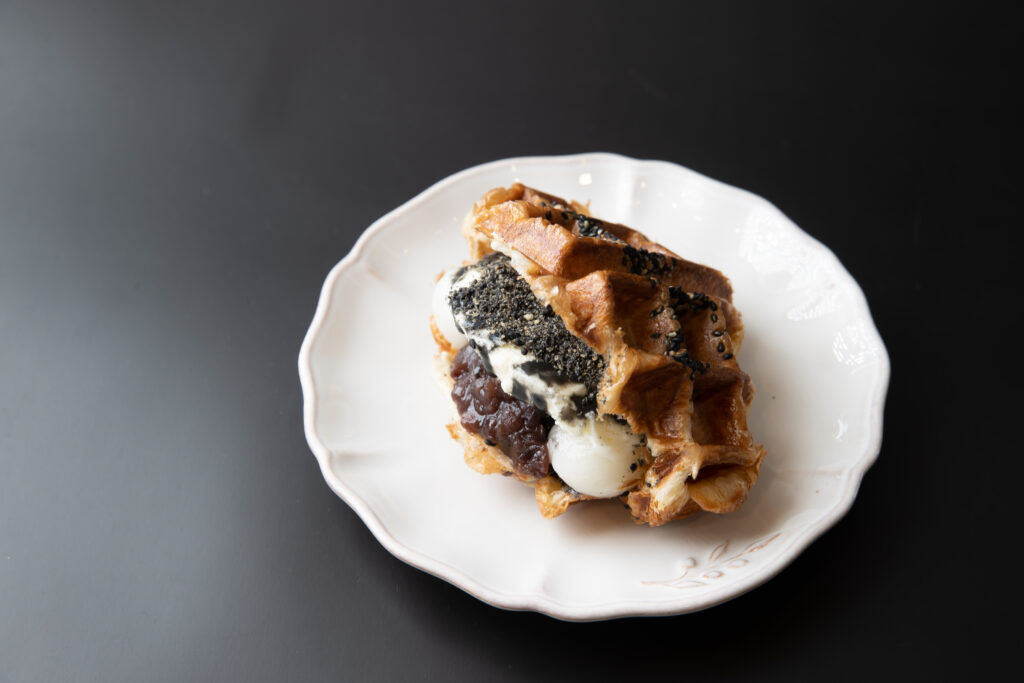 サックサクのクロワッサンワッフルに、豆乳ジェラート(豆乳ソフト)・あんこ・白玉がサンドされています。どれにしようか迷ったらこれを食べてほしい、おススメの1品‼
