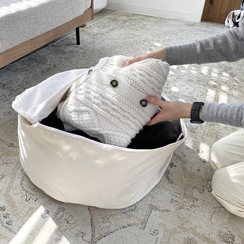 そしてそして、冬物の片付けにとっても良さそうなこちらが気になっています。“マルチ収納クッションカバー”。使用していないブランケットやぬいぐるみ、アウターなどを収納すれば、クッションに早変わり。サイドにはスマホやリモコンが収納できるポケット付き!