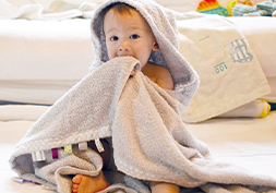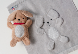 くるくるっと巻いたらぬいぐるみ、広げると耳や手や足を引っ張って遊べるタオル。
