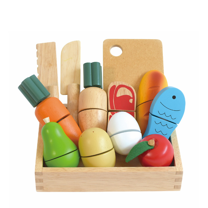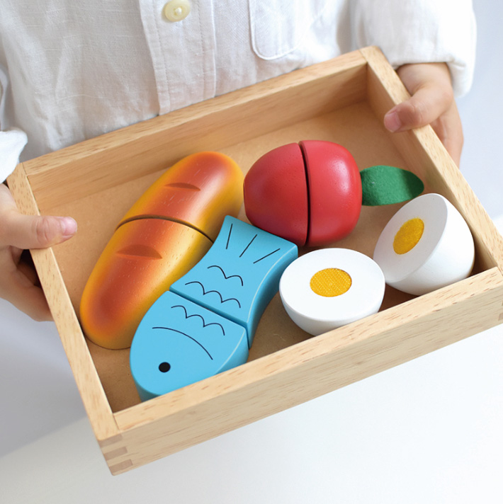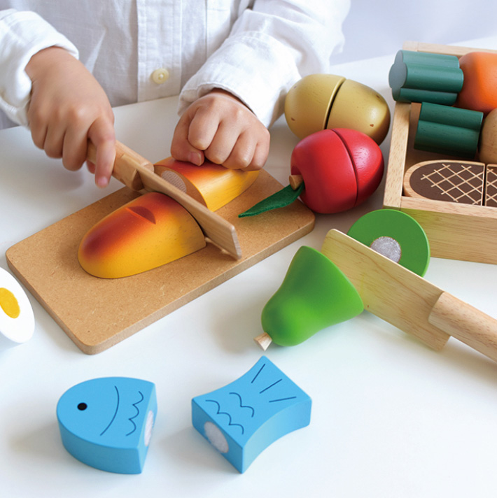 豊富な種類と大きめサイズの食材、包丁、まな板、木箱のファーストおままごとセット。アルコール除菌可能!口に含んでも害のない安全な塗料を使用しているので、安心して遊べる木のおもちゃです。